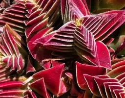 叶子表面宽厚,富肉质感且带有磨纱质感,看像石头质地;开红色小花,生于植株顶部,倒伞形密生,形状像花…