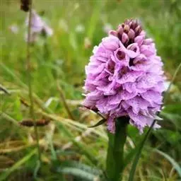 花葶从叶丛中抽出,直立,长达70余厘米;花序柄被2-3枚筒状鞘和数枚苞片状叶,密被短毛;总状花序长5-10厘米,密生许多花;花苞片宿存,草质,向外伸展,卵状披针形,长1-2厘米,基部上方宽5-10毫米,先端急尖,边缘多少波状,被毛或有时近无毛;花梗和子房白色,纤细,斜立,长达4厘米,被短毛;花白色或偶见淡紫红色,后来转为桔黄色;萼片和花瓣常反折,质地较厚,干后变黑色;中萼片近椭圆形,长9-12毫米,中部宽4.5-5.5毫米,先端锐尖或具细尖头,具5条脉,其中中间3条较明显,背面被短毛;侧萼片稍斜的倒卵状披针形,比中萼片稍大,具5条脉,背面被短毛。