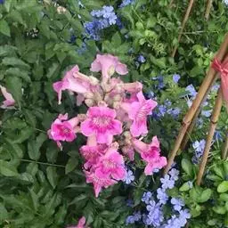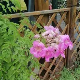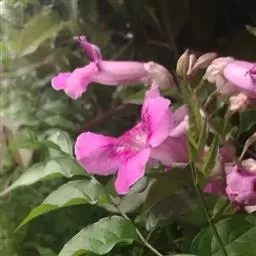 粉花凌霄 K.Schum.)是紫葳科魔盒凌霄属的落叶藤本植物。奇数羽状复叶对生,小叶全缘,…