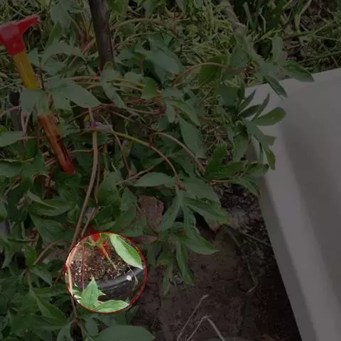 由立枯丝核菌引起的猝倒病症状:发病后有褐色的霉状物附着在病上。霉状物可以从盆土延伸到植株上。仔细观察可以看到这是由于植物根茎部长出的霉状物。立枯丝颜色常为红褐色,外形似蜘蛛网。