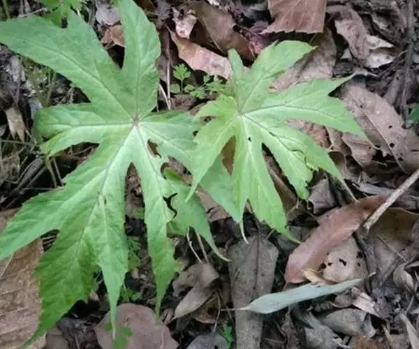 叶均基生,具长柄;叶片轮廓宽卵形至扁圆形,长10-17厘米,基部近截形或微心形,5-6深裂,裂片长圆形至椭圆形,长5-13厘米,先端渐尖,基部楔形,通常不再分裂,两侧裂片较小,边缘常浅裂,裂片三角形,全边具粗而浅不等大之齿,齿尖常带短芒,干时上面褐绿色,散生短硬毛,下面色淡,沿脉散生糙伏毛,毛略不等长,掌状5-6条脉,至分裂处呈羽状脉;叶柄细弱,长8-28厘米,被褐色卷曲长毛,在上部密,以后逐渐减少;托叶卵形,长5-8毫米,宽3-5.5毫米,先端渐尖,顶端带刺毛,全缘,无毛。