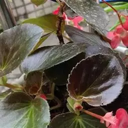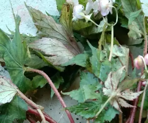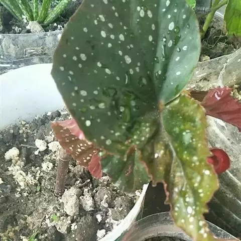 真菌病害,由葡萄孢菌引起的灰霉病症状:秋海棠叶片灰霉病经常发植株的下部,尤其是根茎处与基质接触的地方更容易感染病菌,被水浸润的病斑很快会扩散到整个叶整个植株,受害区域呈现坏死斑点,逐渐由褐色转变为黑色。当夜间温度较低、白天温度较高而且湿高时,病原孢子生长加快,受害的叶片上会长出灰绿色的霉状物。