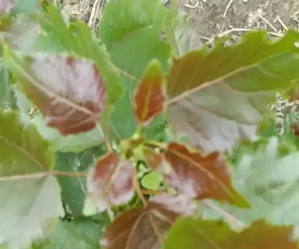 病症特点:当年生幼树上,刚开始在叶、芽、嫩茎上发现灰黄色斑点,之后逐渐扩大,变为褐色或红褐色斑块,或叶面卷曲,严重时造成叶片脱落,嫩茎畸形。
