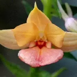 花瓣斜菱形,长5-8毫米,中部宽3.5-4毫米,先端钝,基部收狭,具爪,具1脉,无毛,与中萼片粘合呈兜状;唇瓣长6-8毫米,宽3.5-4.5毫米,基部凹陷呈囊状,囊半球形,内面具多数腺毛,前部舌状,先端略反曲,背面有时具红褐色斑块;蕊柱长3毫米;花药卵形,长4毫米;花粉团长3毫米;蕊喙直立,长2.5毫米,叉状2裂;柱头1个,位于蕊喙之下。花期7-9月。