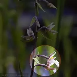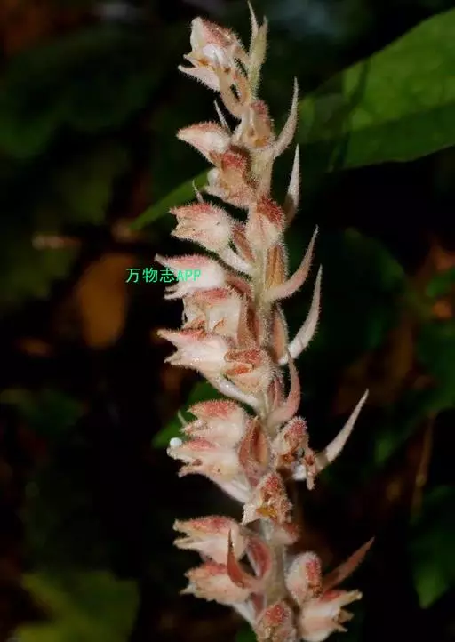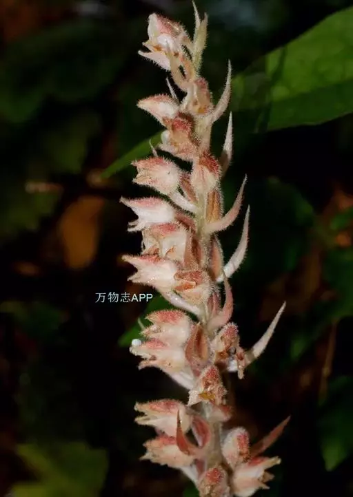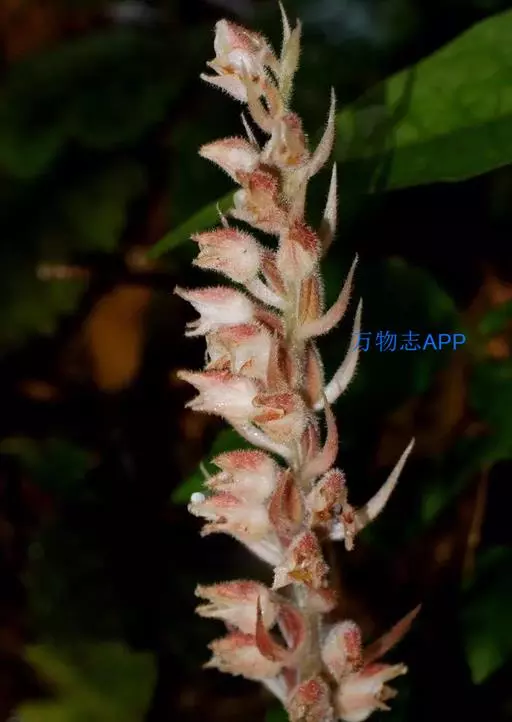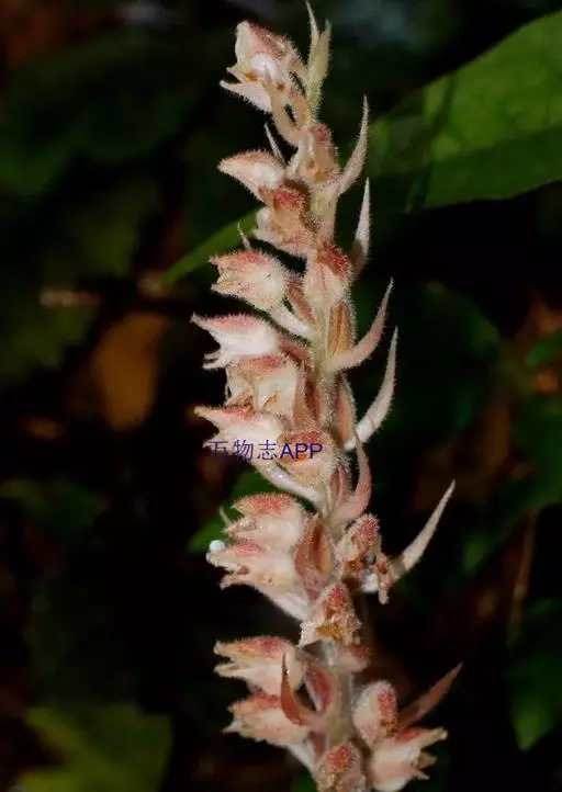 花茎直立,长6-8厘米,被毛;总状花序具几朵至多朵密生而常偏向一侧的花,花序梗极短或长,无或具几枚鞘状苞片;花苞片披针形,长1-1.5厘米,宽2-2.5毫米,背面被毛;子房圆柱形,被毛,连花梗长8-10毫米;花中等大,半张开,白带粉红色、白带淡绿色或近白色;萼片狭卵形,凹陷,长5-8毫米,宽3.5-4毫米,先端钝,具1脉,背面被毛。