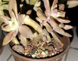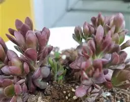 红卷叶 景天科风车草属的多肉植物,株型和石莲花属的极为相似,花瓣披蜡,叶面有白粉。平时为绿色日照充足的时叶色为朱红带褐色,养护得当会开出黄色星状小花。