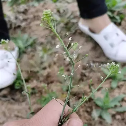 荠(学名:Capsella bursa-pastoris (Linn.) Medic.)十字花科荠属一年生或二年生草本植物,高可达50厘米,茎直立,基生叶丛生呈莲座状,叶柄长5~40毫米,茎生叶窄披针形或披针形,总状花序顶生及腋生,萼片长圆形,花瓣白色,花果期4~6月。