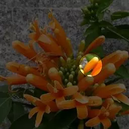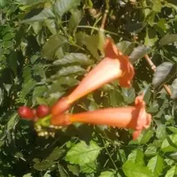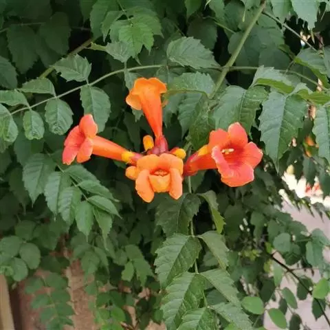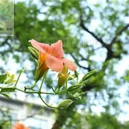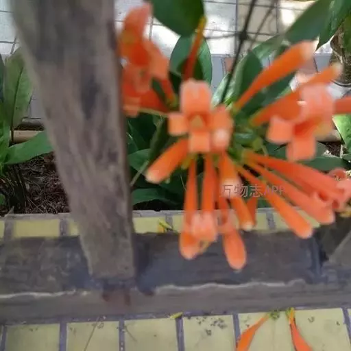 多植于庭园建筑物的四周,攀援于凉棚上,初夏红橙色的花朵累累成串,状如鞭炮,故有炮仗花之称。