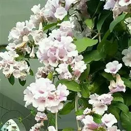 粉花凌霄 K.Schum.)是紫葳科魔盒凌霄属的落叶藤本植物。奇数羽状复叶对生,小叶全缘,…
