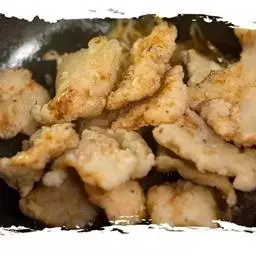 2.将玉米淀粉与温水混合后,搅拌均匀。将肉片一一沾上均匀的沾上淀粉,沾上淀粉后的肉片放入五成热的油锅中,煎大约半分钟,待肉片变硬挺了,捞出,控油。