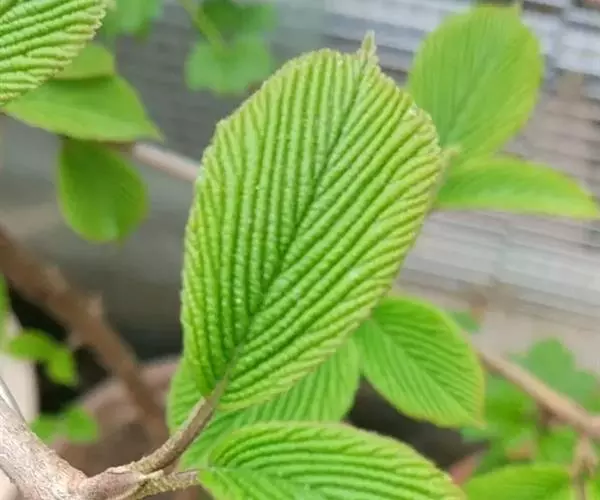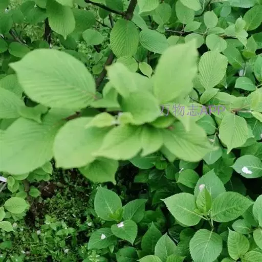 叶纸质,宽卵形、圆状倒卵形或倒卵形,稀近圆形,长4-10厘米,顶端圆或急狭而微凸尖,基部圆形或宽楔形,很少微心形,边缘有不整齐三角状锯齿,上面疏被短伏毛,中脉毛较密,下面密被绒毛,或有时仅侧脉有毛,侧脉10-12 (-13) 对,笔直伸至齿端,上面常深凹陷,下面显著凸起,小脉横列,并行,紧密,成明显的长方形格纹;叶柄长1-2厘米,被薄绒毛;无托叶。