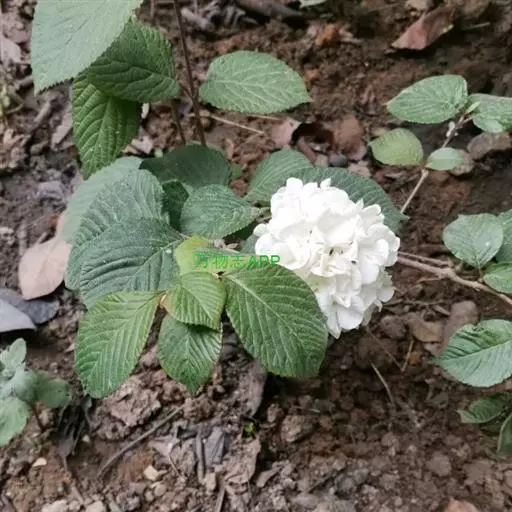 叶较狭,宽卵形或矩圆状卵形,有时椭圆状倒卵形,两端有时渐尖,下面常带绿白色,侧脉10-17对。花序直径4-10厘米,外围有4-6朵白色、木型的不孕花,具长花梗,花冠直径达4厘米,不整齐4-5裂;中央可孕花直径约3毫米,萼筒长约15毫米,花冠辐状,黄白色,裂片宽卵形,长约等于筒,雄蕊高出花冠,花药近圆形。果实先红色后变黑色,宽卵圆形或倒卵圆形,长5-6毫米,直径约4毫米;核扁,两端钝形,有1条上宽下窄的腹沟,背面中下部还有1条短的隆起之脊。花期4-5月,果熟期8-9月。