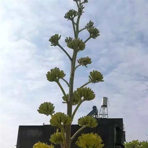 圆锥花序长达5-7米,有少数分枝;花长约5厘米;花被管短,花被裂片6;雄蕊6,着生于花被管喉部,花丝线形,伸出于花被裂片外;子房下位,3室,花柱长,柱头头状。蒴果近球形,3裂,具柄,顶端具短喙。生命周期相当于剑麻。