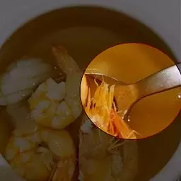 将豆浆放在大缸里稍微凉一下以后,就开始点卤水了。豆腐倌将卤水盛在一个小碗里,倒里边一点,就用勺子在豆浆中搅一搅,眼睛始终注意着豆浆的变化。再放一点卤水,再搅一搅,直到认为满意为止。这是做豆腐的最关键的手艺,不是一般人都可以会的。每一个豆腐倌都有自己的诀窍,密不传人,因为更多的人会了这套手艺,自己的饭碗就会不牢。