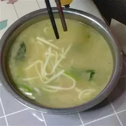 这时候,把缸的盖子盖上,等一会儿,看到豆浆已经成了脑了,里边有一朵一朵的豆腐花,与清水相伴的时候,也就是豆浆分离为豆腐花和清水的时候,就可以压豆腐或是干豆腐了。