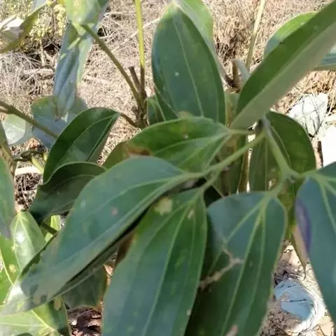 症状:主要为害天竺桂叶片。病菌大部分从叶尖或边缘侵入。感病叶片初期出现赤褐色,周围有较宽黄色环晕的小点,扩大后为圆形或不规则的病斑,黄褐色,最后中央灰白色,上散生黑色小点。病部与健部交界处有一明显深褐色的缘带。一般在高温高湿的环境条件下易发生,夏、秋季病害发生较重。 防治方法:25%火把可湿性粉剂对天竺桂叶斑病病原菌菌落生长的速率、孢子的萌发率及叶片感染率的抑制作用最大,其次为露易和腈福2种杀菌剂。