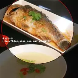 6.加少许水淀粉勾芡一下,稍加收干,再淋回鱼头上;再淋上少许葱油增香。