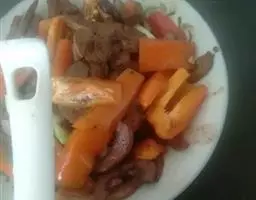 4.然后将切好的西红柿片放入锅内,放入少许生抽,至七成熟。