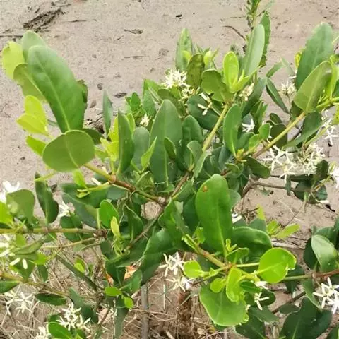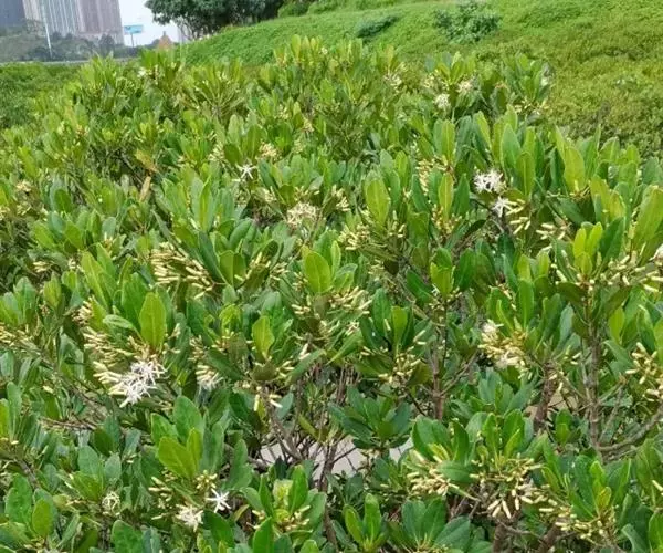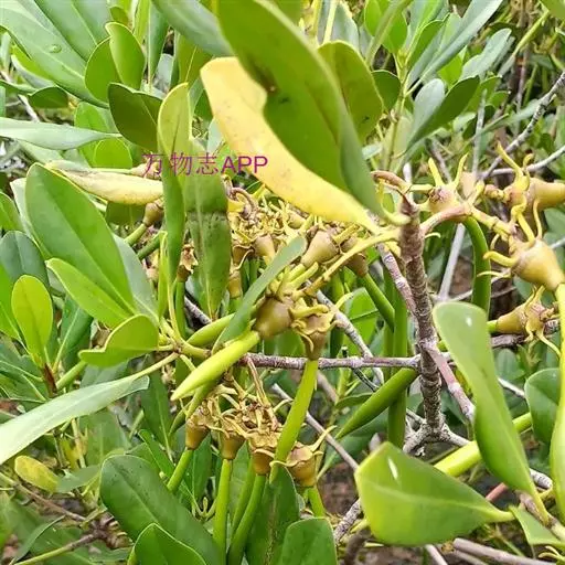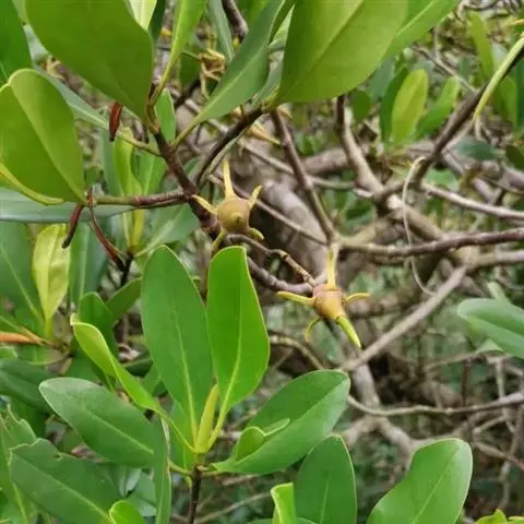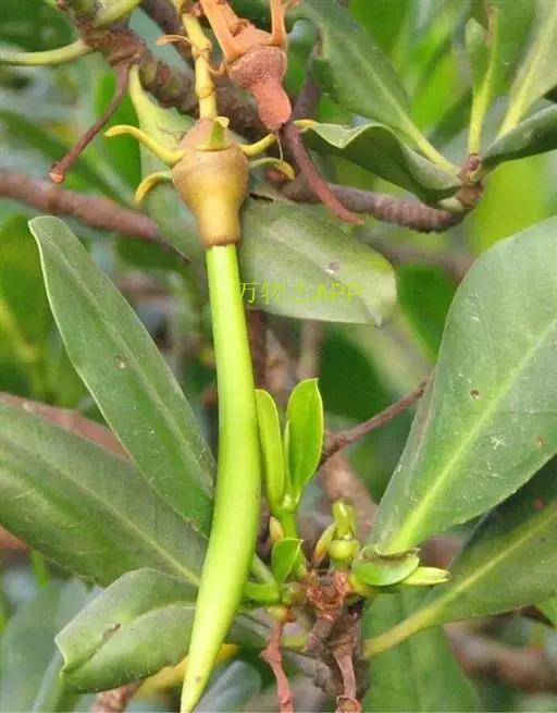 灌木或小乔木,高2-3米;树皮平滑,红褐色;枝粗壮,有膨大的节。叶椭圆形、矩圆状椭圆形或近倒卵形,长5-9厘米,宽2.5-4厘米,顶端钝形或浑圆,基部阔楔形,全缘,叶脉不明显;叶柄粗壮,长1-1.5厘米;托叶早落,长1.5-2厘米。二歧聚伞花序,有花4(-9)朵;总花梗长短不一,1-3个着生上部叶腋,长2-4厘米;花具短梗,盛开时长1-2厘米,直径2-2.5厘米;花萼裂片革质,长1-1.5厘米,宽1.5-2毫米,短尖,花后外反;花瓣白色,膜质,短于花萼裂片;雄蕊无定数,长短不一,长6-12毫米;花柱丝状,与雄蕊等长。果实圆锥形,长1.5-2厘米,基部直径8-10毫米;胚轴细长,长12-20厘米。花果期几乎全年。 “胎生”植物:秋茄树