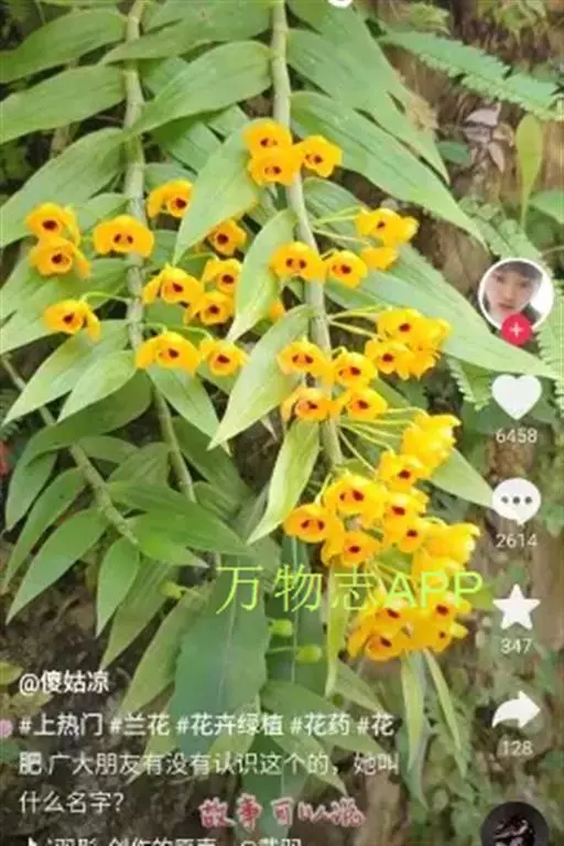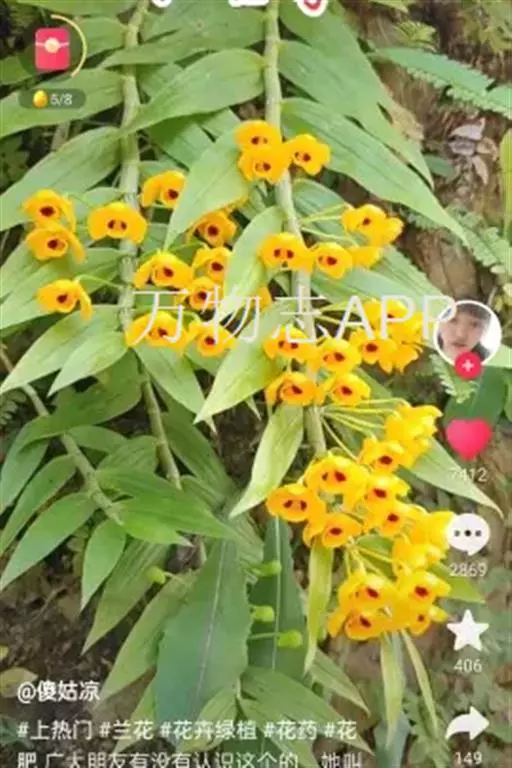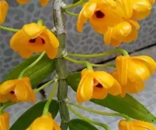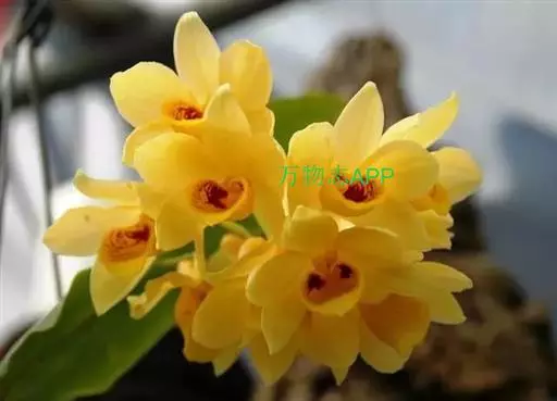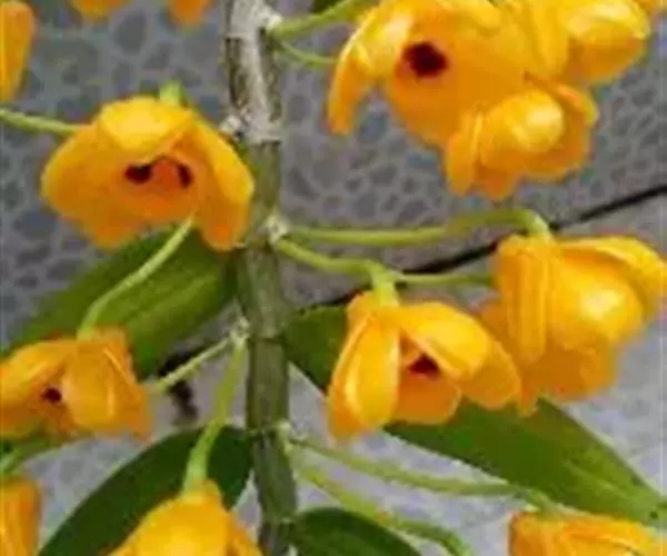 束花石斛(学名:Dendrobium chrysanthum Lindl.):茎粗厚,肉质,下垂或弯垂,圆柱形,不分枝,具多节。叶二列,互生于整个茎上,纸质,长圆状披针形。伞状花序近无花序柄,每2-6花为一束,侧生于具叶的茎上部;花黄色,质地厚;花瓣稍凹的倒卵形,长16-22毫米,宽11-14毫米,先端圆形,全缘或有时具细啮蚀状,具7条脉;唇瓣凹的,不裂,肾形或横长圆形。蒴果长圆柱形,花期9-10月。