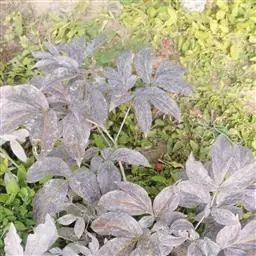 紫牡丹(图3) 复合肥。新上盆的牡丹,不能施肥,特别忌施浓肥,否则肉质根会发霉烂死。半年后可逐渐施些薄肥,如腐熟的鸡粪水或豆水等,肥水比例以20%~30%为宜。新上盆的牡丹第一年不一定能开出好花,但培养1~2年后,就能连年开花。牡丹一年在4月中、下旬开花,开花前可追施1~2次液肥;开花后半个月再追施1~2次液肥;伏天可用麻酱渣(每盆约40~50克)施1次干肥,以利花芽分化。