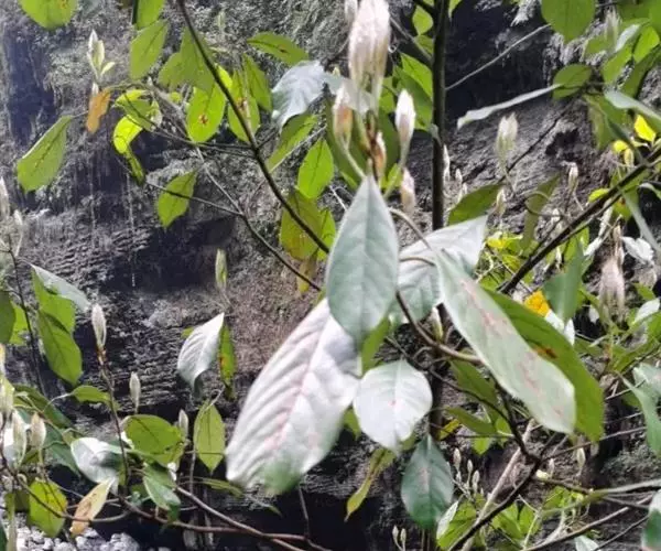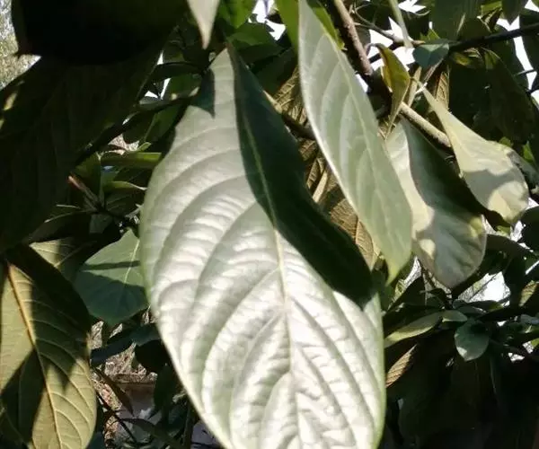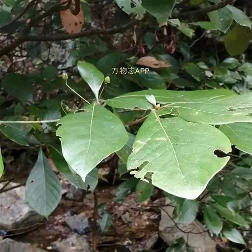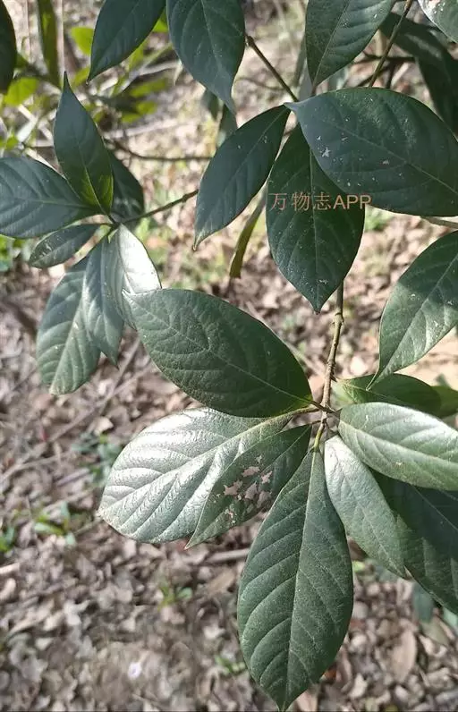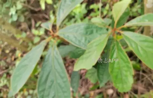 小枝、叶柄及花序密被黄褐色或灰黑色柔毛或绒毛。叶革质,倒卵形、椭圆状倒卵形或阔倒披针形,长8-27厘米,宽3.5-9厘米,通常长12-18厘米,宽4-7厘米,先端突渐尖或突尾状渐尖,基部渐狭,上面完全无毛或沿脉上有毛,下面密被黄褐色长柔毛,少为短柔毛,中脉和侧脉上面下陷,侧脉每边8-13 条,弧形,在边缘联结,横脉及小脉多而密集,结成明显网格状;叶柄长1-2.5厘米。