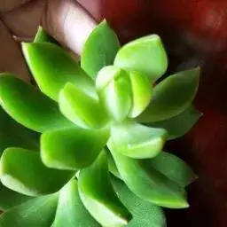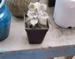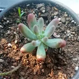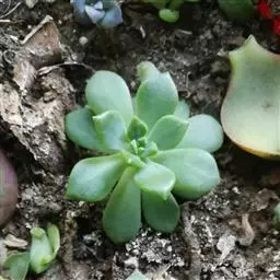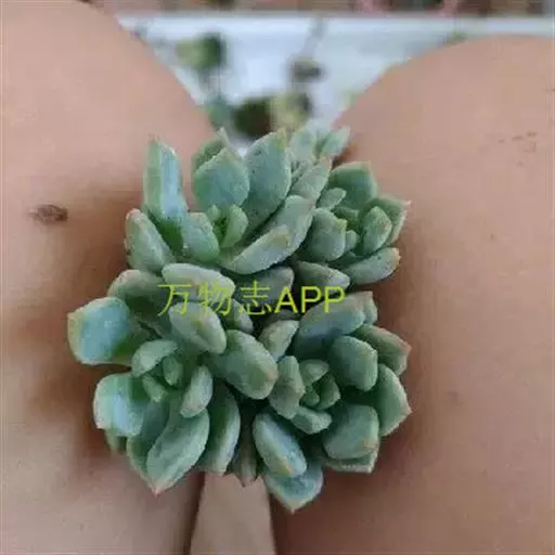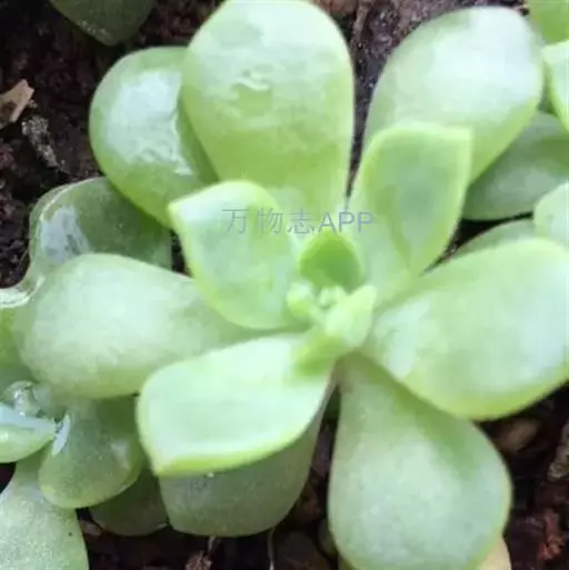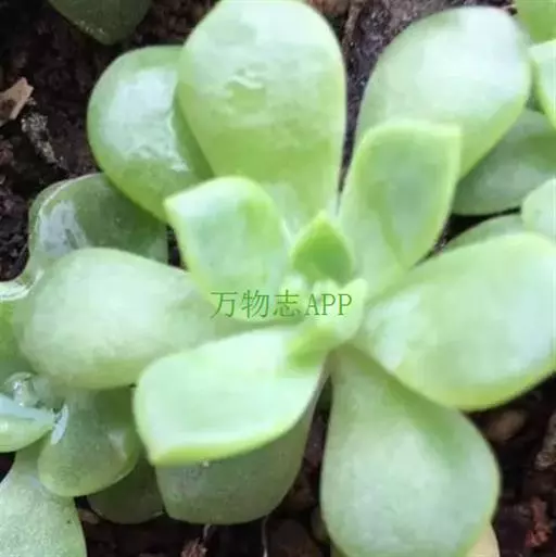 小型多肉品种。有茎,叶互生,排列成莲座状,匙形,表面光洁,正面平坦,背面隆起,肉质厚实,翠绿色,或嫩绿色,叶面上被白粉,有纵向暗纹,并透出密布的极细微的白色颗粒,犹如凝冻的脂肪,经充足的阳光照射,叶尖会出现美丽可爱的小红点。常从茎的下部生出新芽,形成群生状。春季开出成簇小花,白色,花药紫色。据说植株经太阳晒过后,会散发淡淡的香味,故有人叫它“香石莲”。