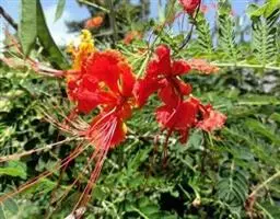 洋金凤 Sw.),豆科小凤花属灌木状或小乔木植物,枝无毛,绿或粉绿色;二回羽状复叶;总状花序伞房状,…