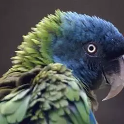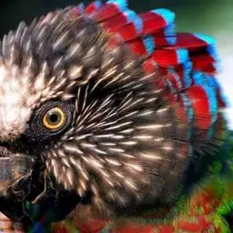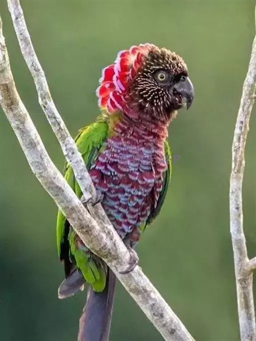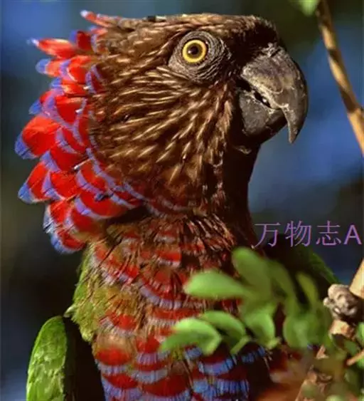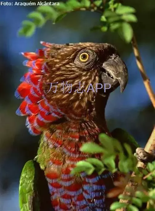 鹰头鹦鹉(学名:Deroptyus accipitrinus):鹰头鹦鹉体长35厘米,体重190-277克。额头和顶冠具柔和的白色,眼先深褐色,枕部和头部两侧有棕色羽毛,并具有柔软的白色条纹, 后颈有长长的暗红色羽毛并镶有蓝边,有2个亚种,是典型的攀禽,鸟喙强劲有力,喙钩曲,上颌具有可活动关节,喙基部具有腊膜。肌肉质舌厚。脚短,强大,对趾型,两趾向前两趾向后,适合抓握和攀援生活。羽毛。晚成雏。是非常独特与美丽的南美洲鹦鹉,也是唯一会把整个颈部以上的冠羽如伞蜥蜴般扩展开的鹦鹉,看起来很像印地安人的羽冠,头部与胸腹部羽色鲜艳美丽,神情起来份外像老鹰,极为特别。