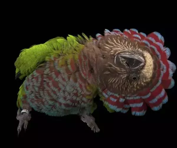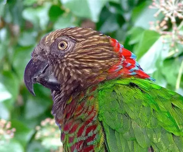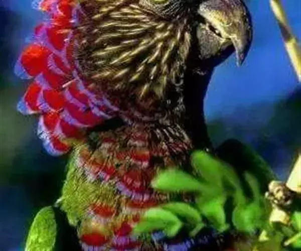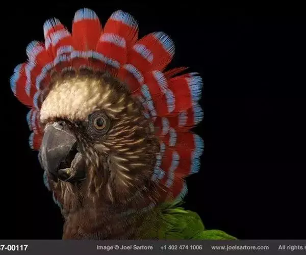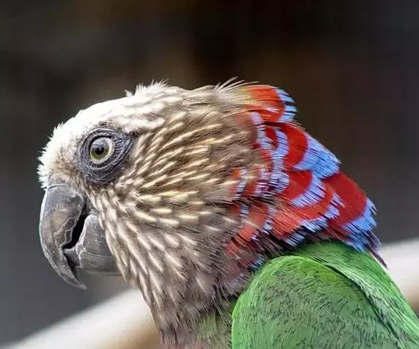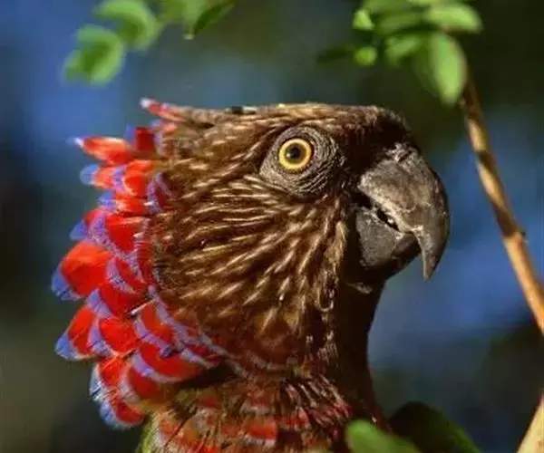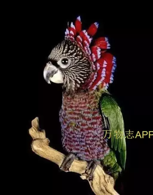 是唯一会把整个颈部以上的羽冠如伞蜥蜴般扩展开的鹦鹉,看起来很像印地安人的羽冠,头部与胸腹部羽色鲜艳美丽,神情起来份外像老鹰,极为特别。