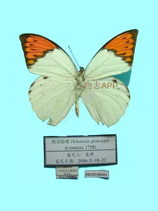 鹤顶粉蝶 (Hebomoia glaucippe Linnaeus)是粉蝶科鹤顶粉蝶属的一种蝴蝶。鹤顶粉蝶是我国的粉蝶当中体型最大的一种。它们的卵特别大,是国产蝴蝶中最大的,其卵长达3mm。幼虫也是国产粉蝶中最大型的,体长可达76mm;在广州,它们每年可发生近十个世代。成虫由春天的3月末至入冬的12月末都可见其疾飞的身影,是粉蝶中飞行最快的蝶种。其前翅顶端的红斑特别引人注目。