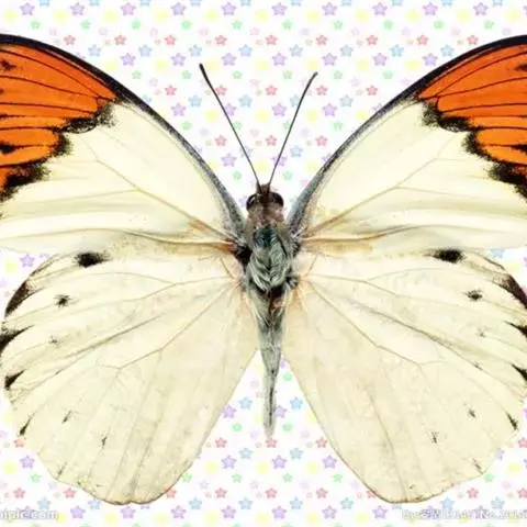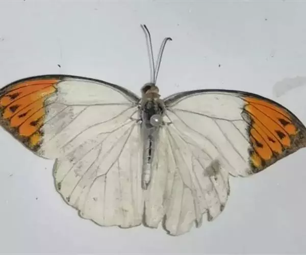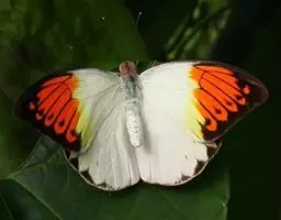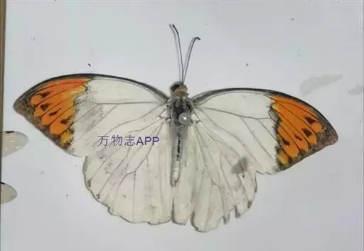 成虫:雄蝶翅白色,前翅前缘及外缘黑色,自前缘1/2处至外缘近后角处有黑色锯齿状斜纹,围住顶部三角形赤橙色斑,斑被黑色脉纹分割;室内有1列黑色箭头纹;后翅外缘脉端有黑箭头纹。雌蝶黄白色,散布有黑色鳞粉,后翅外缘、亚缘各有1列明显的黑色箭头纹。反面前翅端半部和整个后翅满布褐色细纹。春型个体小,翅稍尖。