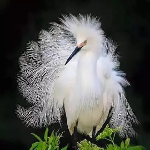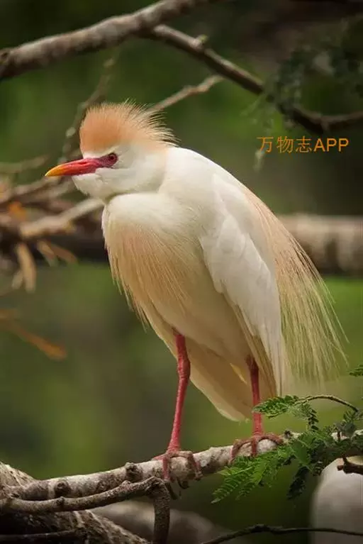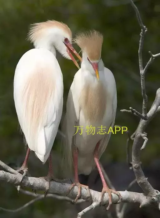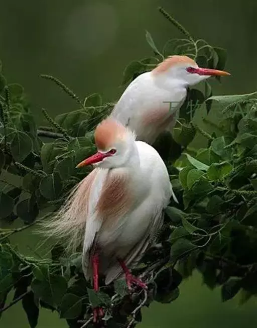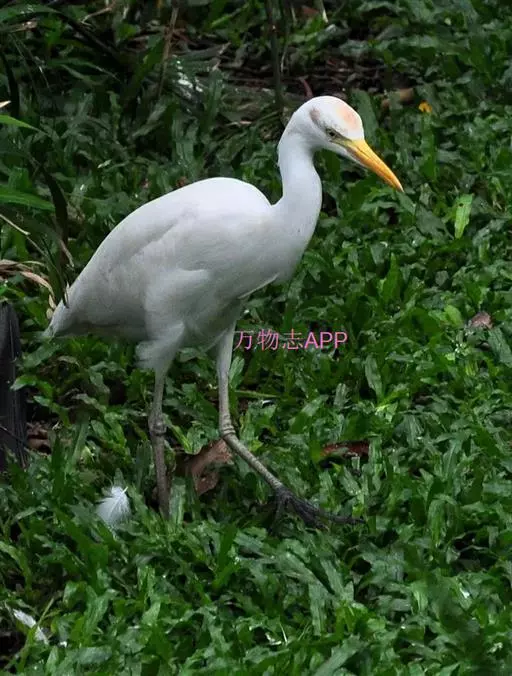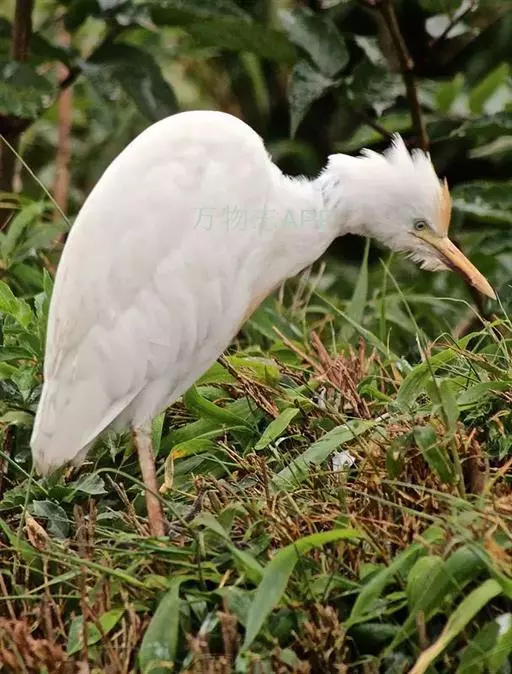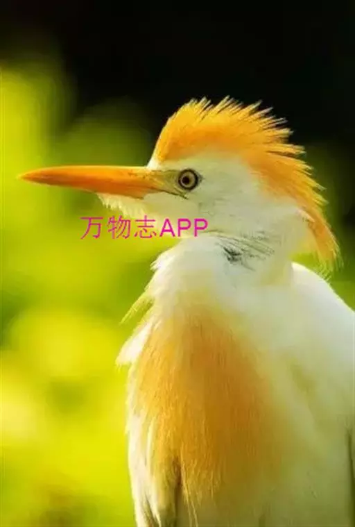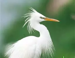 牛背鹭(学名:Bubulcus ibis):体较肥胖,喙和颈较短粗。夏羽大都白色;头和颈橙黄色,前颈基部和背中央具羽枝分散成发状的橙黄色长形饰羽;前颈饰羽长达胸部,背部饰羽向后长达尾部,尾和其余体羽白色。冬羽通体全白色,个别头顶缀有黄色,无发丝状饰羽。