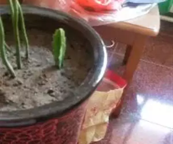 黄肉类型的火龙果砧木可选择野生三角柱(霸王花)等,红肉类型的火龙果可选择白肉类型的火龙果作砧木。选择1-2年生的三角柱,自茎节处从母体上截下,扦插在砂质较重的疏松土壤中(深度为插牢为宜),上搭荫棚,浇透水即可做砧木,约半月插活后就可进行嫁接。接穗以当年生发育较好的枝条为宜。