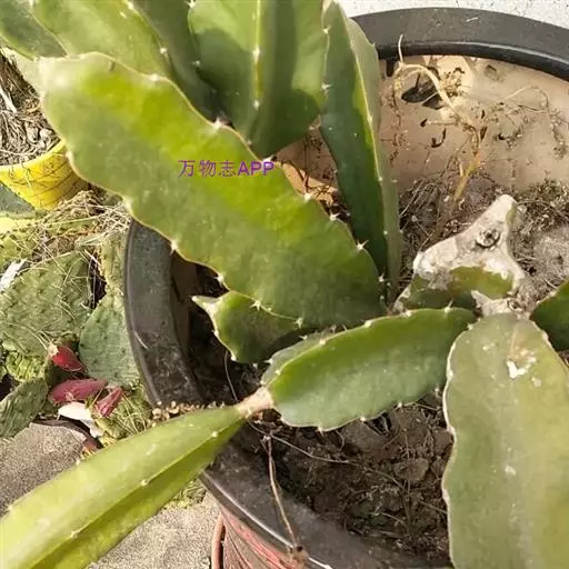 火龙果为多年生攀援性的多肉植物。植株无主根,侧根大量分布在浅表土层,同时有很多气生根,可攀援生长。根茎深绿色,粗壮,长可达7米,粗10-12厘米,具3棱。棱扁,边缘波浪状,茎节处生长攀援根,可攀附其他植物上生长,肋多为3条,每段茎节凹陷处具小刺。由于长期生长于热带沙漠地区,其叶片已退化,光合作用功能由茎干承担。茎的内部是大量饱含粘稠液体的薄壁细胞,有利于在雨季吸收尽可能多的水分。