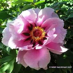 单花顶生,直径7-10厘米;萼片3-5,宽卵形,长1.2-1.5厘米,淡绿色,花瓣6,白色、红色、紫红色,倒卵形,长3-5.5厘米,宽1.8-2.8厘米;雄蕊长1-1.2厘米,花丝淡红色,花药长圆形;花盘浅杯状,包住心皮基部;心皮2-3,无毛。蓇葖卵圆形,长2-3厘米,成熟时果皮反卷呈红色。花期5-6月中旬;果期9月。