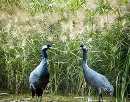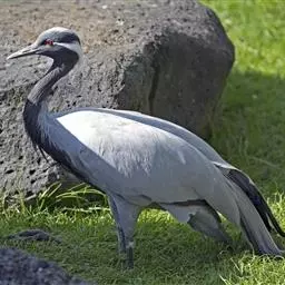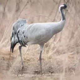蓑羽鹤大型涉禽,体长68~92厘米,是鹤类中个体最小者。通体蓝灰色,眼先、头侧、喉和前颈黑色,…