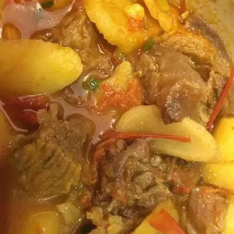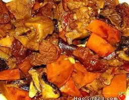 牛肉有滋补健身的作用,但牛肉纤维粗,有时会影响胃黏膜。与土豆、芹菜、葱头、白萝卜、红枣、口蘑搭配后,不但味道好,且弥补了牛肉的缺点。如土豆含有丰富的叶酸,起着保护胃黏膜的作用。芹菜清热利尿,有降胆固醇的作用。白萝卜富含多种维生素,有清热解毒、康胃健脾、止咳止痢及防治夜盲症、眼病、皮肤干燥等功效。洋葱具有祛风发汗、消食、治伤风、促进睡眠的作用。红枣有保肝、镇静、催眠、降压、抗过敏、抗癌、抗菌等作用。口蘑有补益肠胃、抗癌、防衰、延年益寿的功效。此菜的搭配对缺血、脾胃虚弱、营养不良者有一定的疗效。