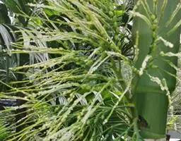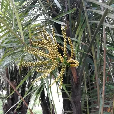 花序长达1.5米,多分枝,佛焰苞在开花前象l根垒球棒;花小,雌雄同株,雄花长6-7毫米,雄蕊6,与花瓣等长,雌花长约为雄花之半。