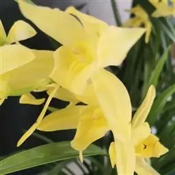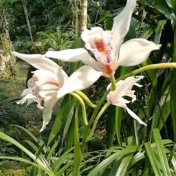 大雪兰(学名:Cymbidium mastersii Griff. ex Lindl.):附生兰。假鳞茎似茎状,包藏于宿存的叶基内。叶数枚至多枚,二列,近革质。花葶常仅1个,从下部叶腋发出,长25-45厘米;总状花序具2-5花;花直径6厘米,不完全开放,白色至淡绿色,唇瓣中裂片上具1个黄色斑块,有时还有紫红色斑点;萼片狭椭圆形或宽披针形及矩圆形;花瓣宽线形,唇瓣矩圆状卵形,与蕊柱基部合生,中裂片自中部至基部具1个密被短毛的斑块。花期10-12月。