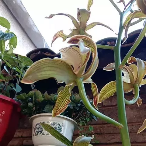 花葶1-2个,从下部叶腋发出,近直立,长25-45厘米;总状花序具2-5朵或更多的花;花苞片三角形,长2-5毫米;花梗和子房长4.5厘米;花直径6-6.5厘米,不完全开放,有香气,白色,外面稍带淡紫红色,唇瓣中裂片中央有一黄色斑块连接于亮黄色的褶片,偶见紫红色斑点;萼片狭椭圆形或宽披针状长圆形,长4.5-5.5(-6)厘米,宽1-1.5(-2)厘米,先端常渐尖.