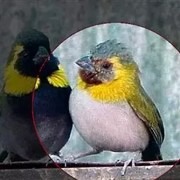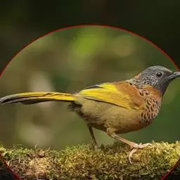 黄喉噪鹛体型略小,顶冠蓝灰色,特征为具黑色的眼罩和鲜黄色的喉。上体褐色,尾端黑色而具白色边缘,…