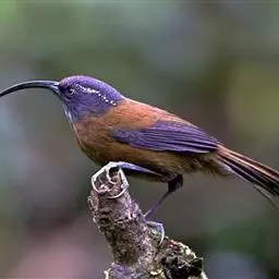 剑嘴鹛:中型鸟类,体长21-22厘米。嘴特别细长而向下弯曲,头顶和头侧烟灰色具长而窄的白色眉纹,…