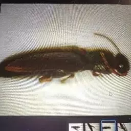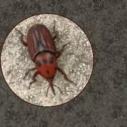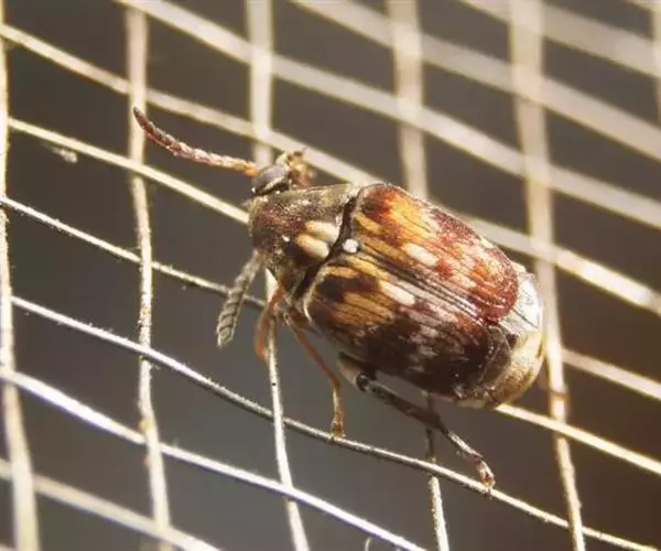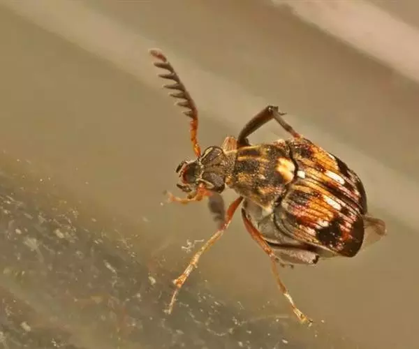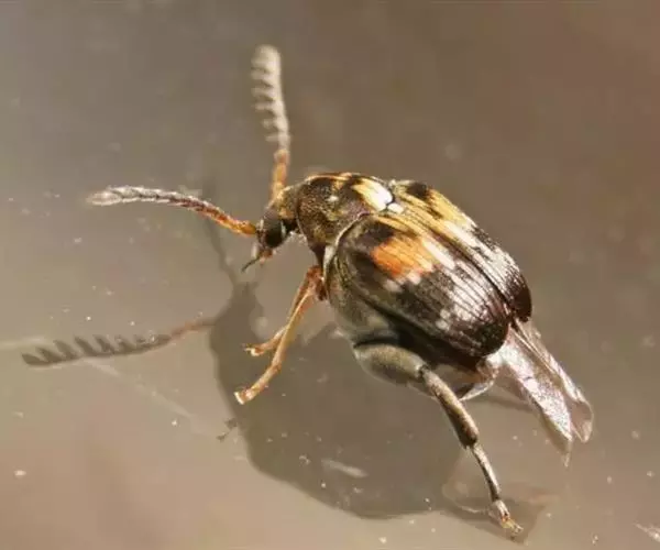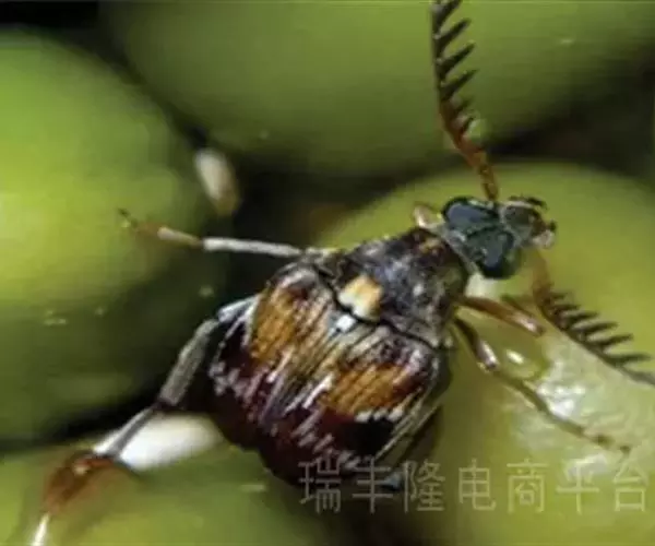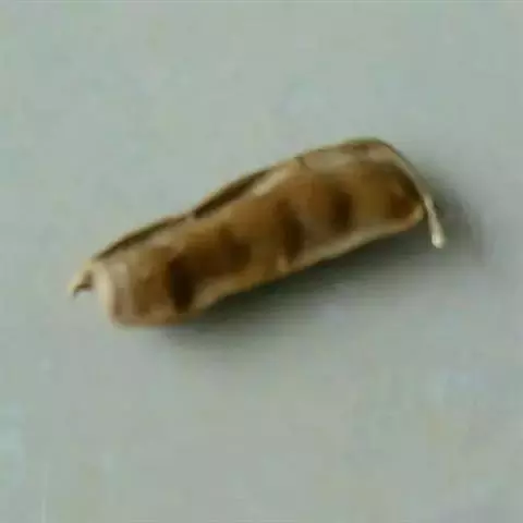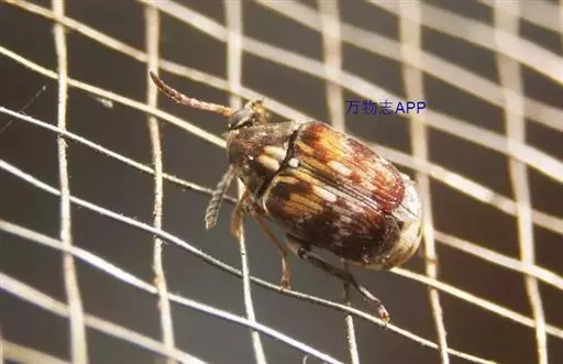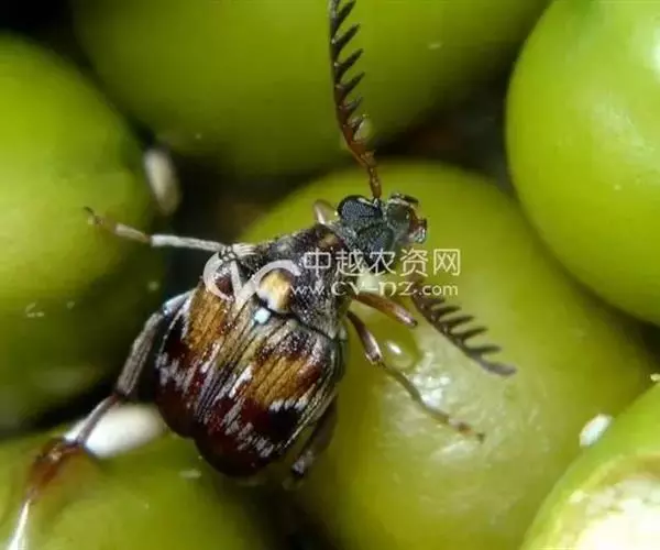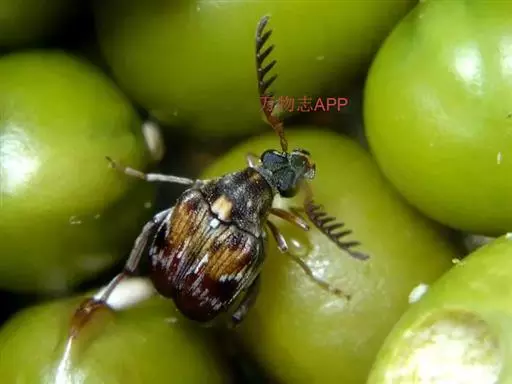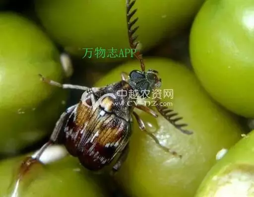 绿豆象 体长2—3.5mm,宽1.3—2mm,卵圆形,深褐色;头密布刻点,额部具一条纵脊,雄虫触角栉齿状,雌虫锯齿状;前胸背板后端宽,两侧向前部倾斜,前端窄,着生刻点和黄褐、灰白色毛,后缘中叶有1对被白色毛的瘤状突起,中部两侧各有一个灰白色毛斑。小盾片被有灰白色毛。鞘翅基部宽于前胸背板,小刻点密,灰白色毛与黄褐色毛组成斑纹,中部前后有向外倾斜的2条纹。臀板被灰白色毛,近中部与端部两侧有4个褐色斑。后足腿节端部内缘有一个长而直的齿,外端有一个端齿,后足胫节腹面端部有尖的内、外齿各一个。