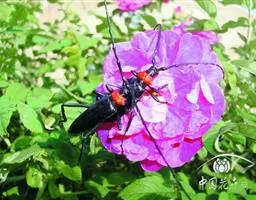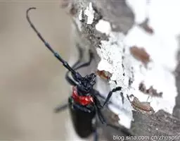 桃红颈天牛是天牛科、颈天牛属昆虫。体黑色发亮,前胸背面大部分为光亮的棕红色或完全黑色。头黑色,…