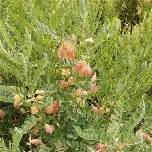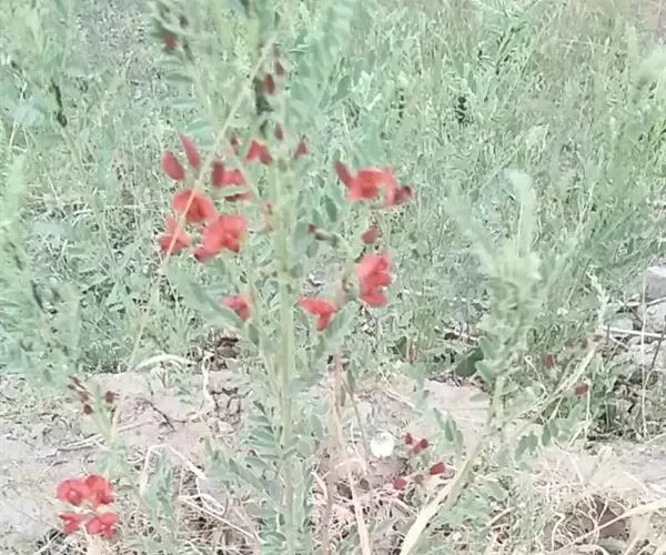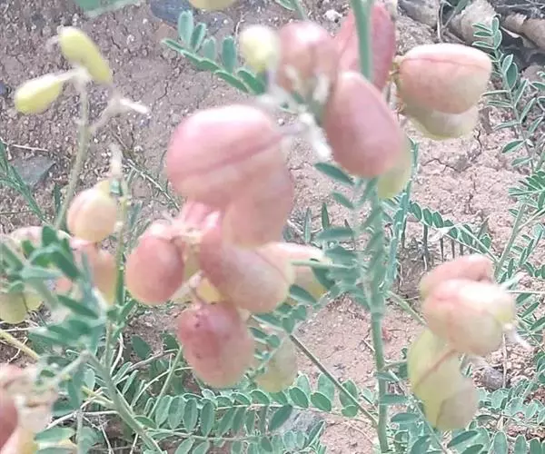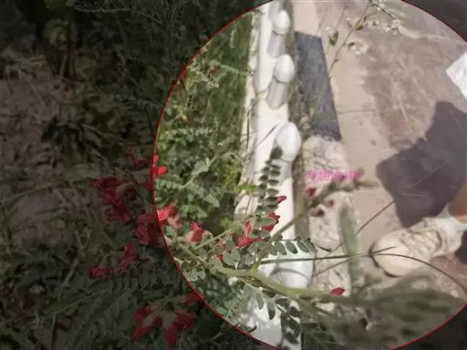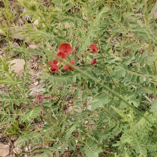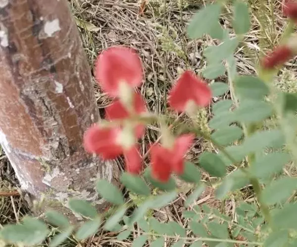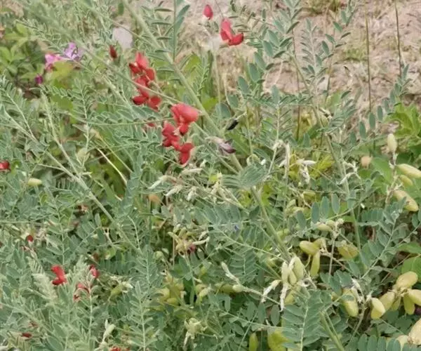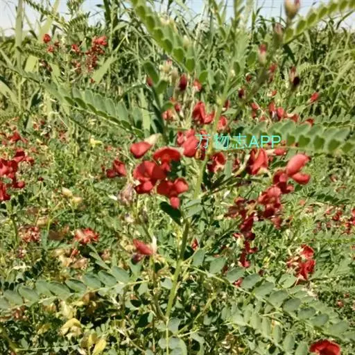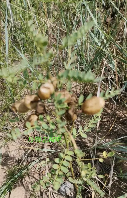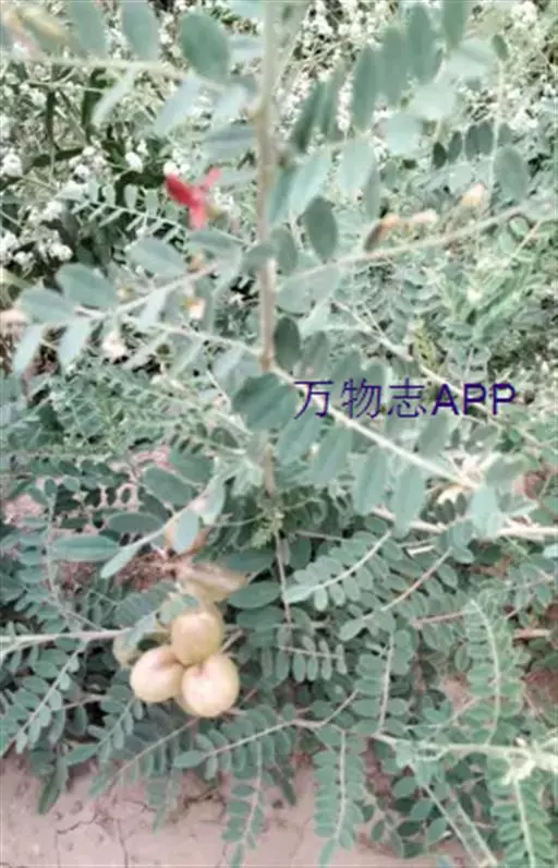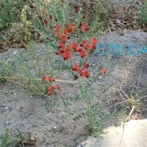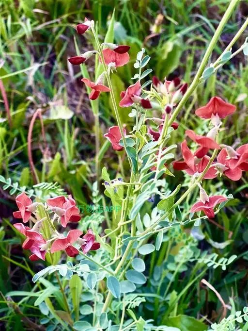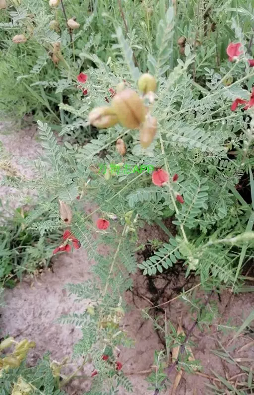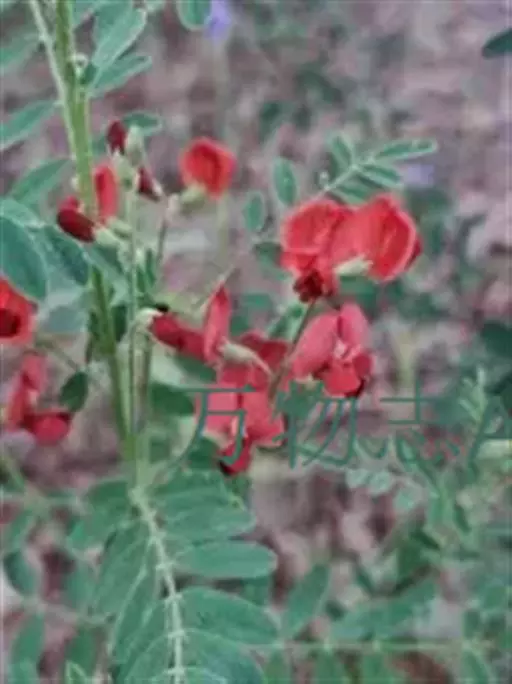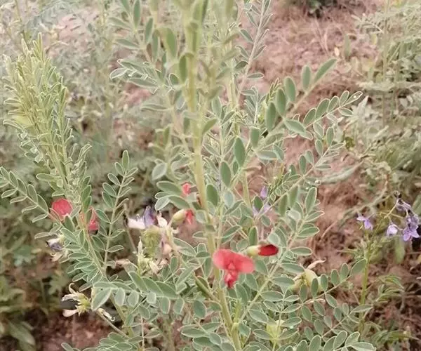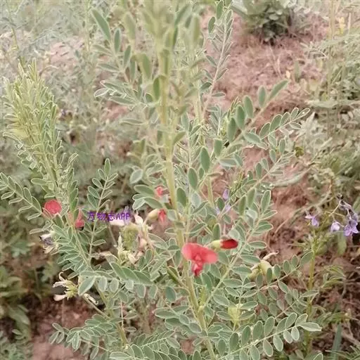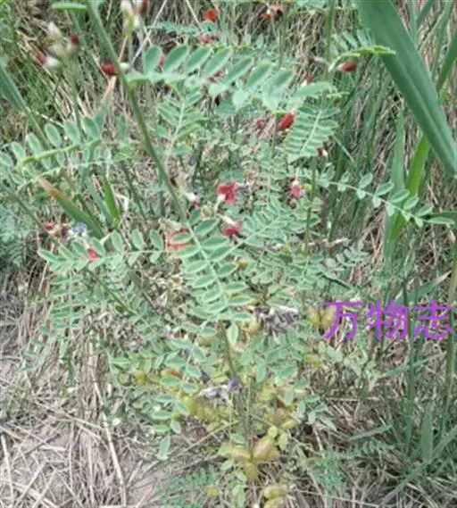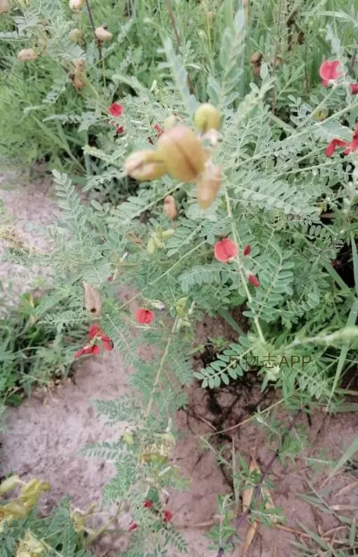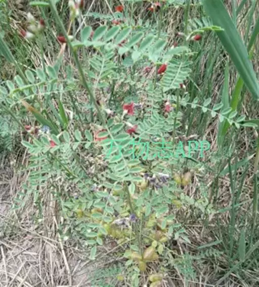 半灌木或多年生草本,茎直立或下部匍匐,高0.3-0.6米,稀达1.3米;枝开展,具纵棱脊,被疏至密的灰白色丁字毛;托叶线状披针形,三角形至钻形,自茎下部至上部渐变小。叶轴长5-8.5厘米,上面具沟槽;小叶11-21片,倒卵形至倒卵状长圆形,长5-15(25)毫米,宽3-6(10)毫米,先端微凹至圆,具短尖头,基部圆至宽楔形,上面疏被毛至无毛,侧脉不明显,下面被细小、白色丁字毛;小叶柄短,被白色细柔毛。总状花序常较叶长,长6.5-13(17)厘米,生6-16花;苞片卵状披针形;花梗长4-5毫米,密被白色柔毛,小苞片线形至钻形;花萼钟状,萼齿三角形,上边2齿较宽短,其余较窄长,外面被白色柔毛;花冠初呈鲜红色,后变紫红色,旗瓣瓣片近圆形,向外反折,长12-13毫米,宽12-16毫米,先端微凹,基部具短柄,翼瓣较龙骨瓣短,连柄长12毫米,先端圆,基部具长3毫米微弯的瓣柄及长2毫米先端圆的耳状裂片,龙骨瓣长13毫米,宽4-5毫米,瓣柄长约4.5毫米,裂片近成直角,先端钝;子房近线形,密被白色柔毛,花柱弯曲,仅内侧疏被纵列髯毛,柱头近球形。荚果椭圆形至卵圆形,膨胀,长1.7-3.5厘米,直径1.7-1.8厘米,先端圆,果颈长约10毫米,果瓣膜质,外面疏被白色柔毛,缝线上较密;种子肾形至近半圆形,长约2.5毫米,褐色,珠柄长1-3毫米,种脐圆形凹陷。花期5-8月,果期6-9月。