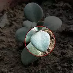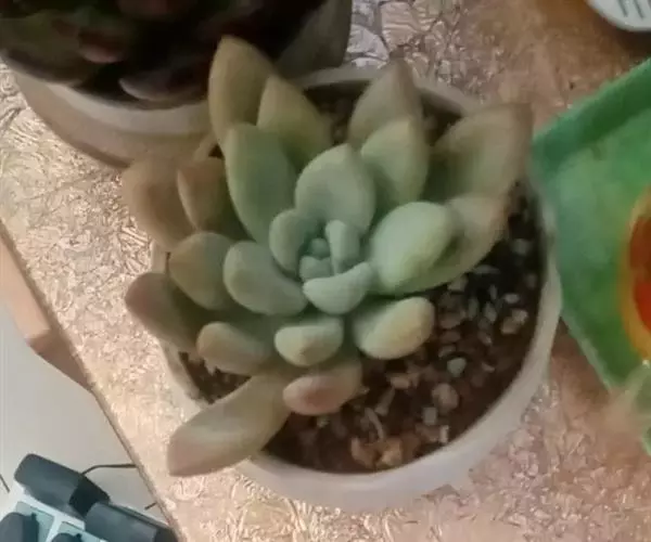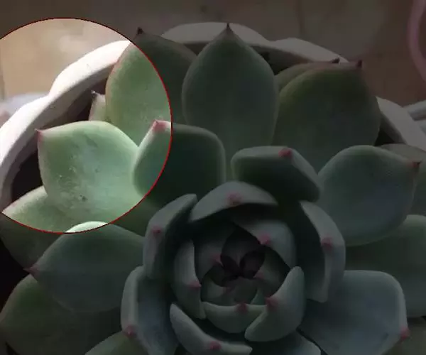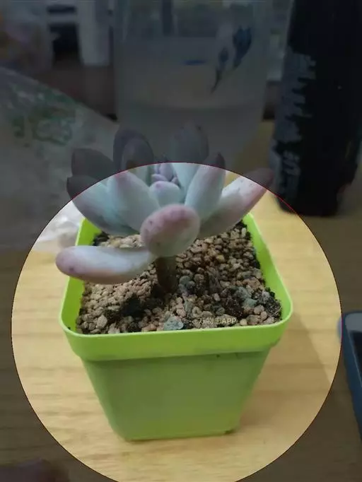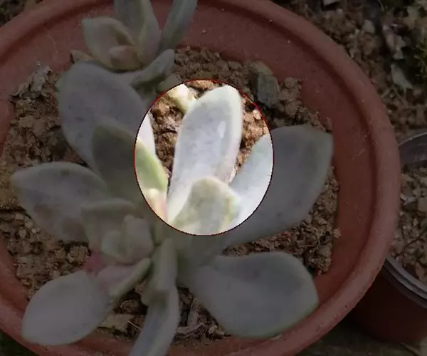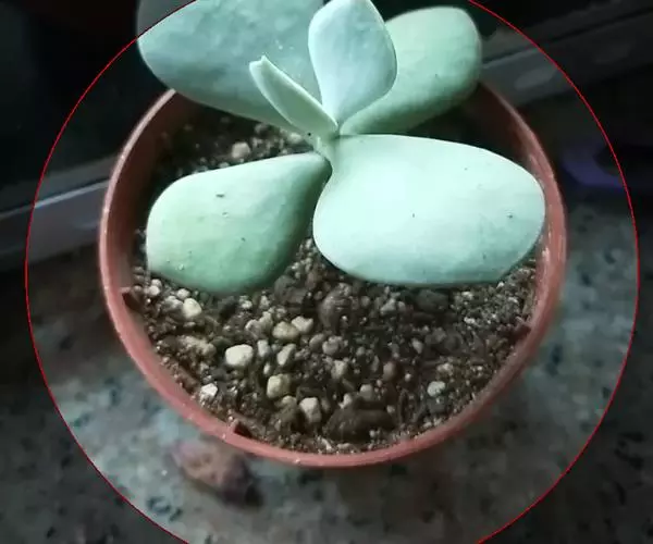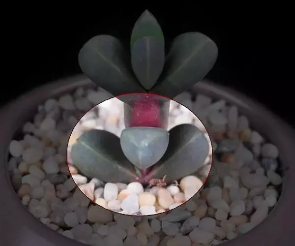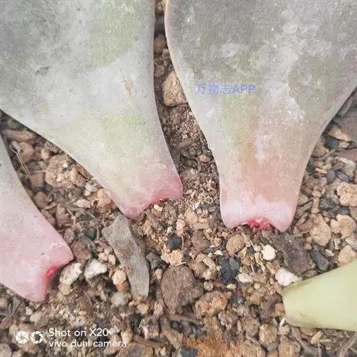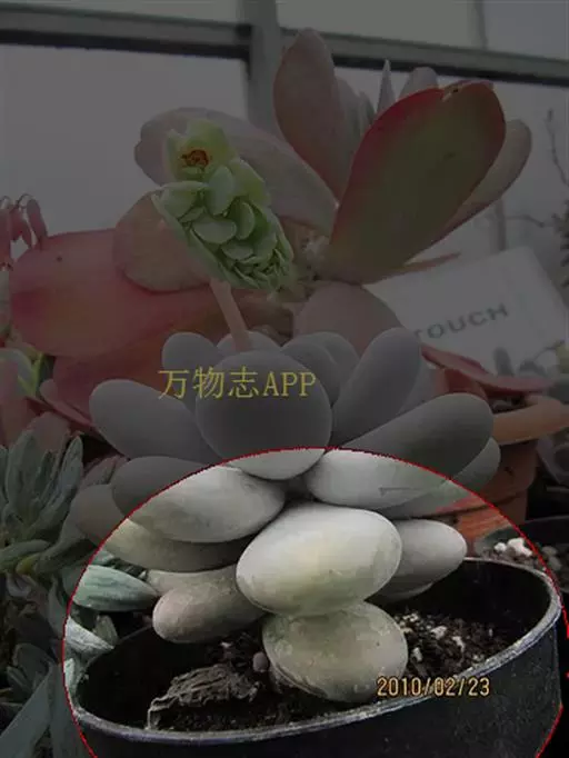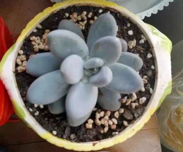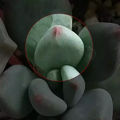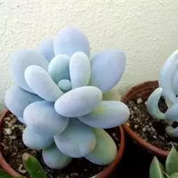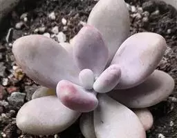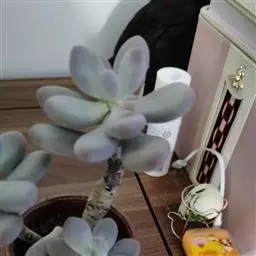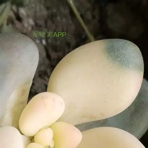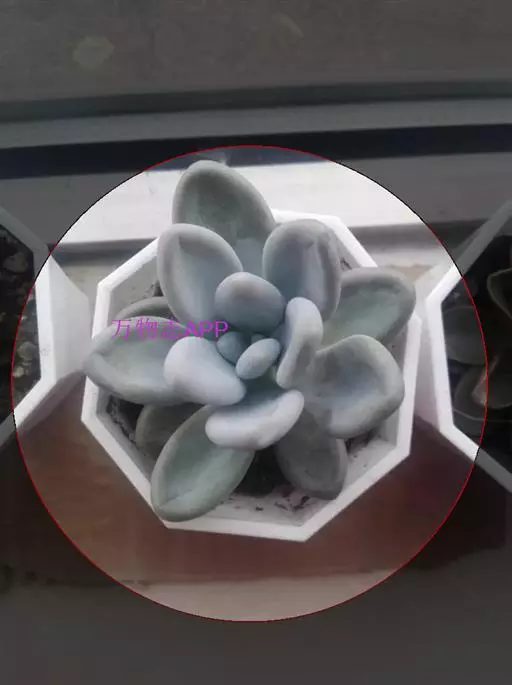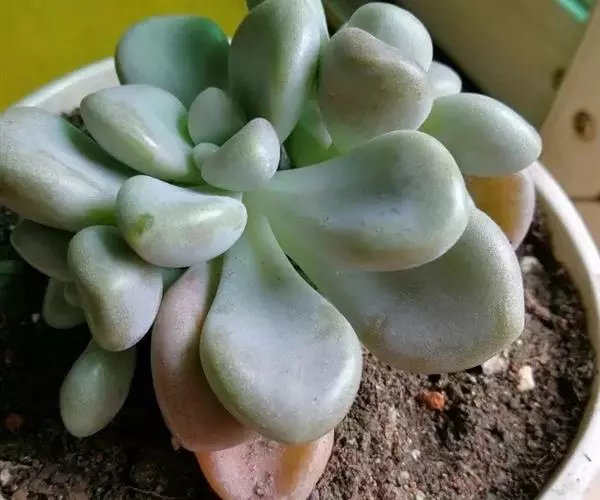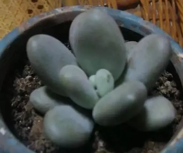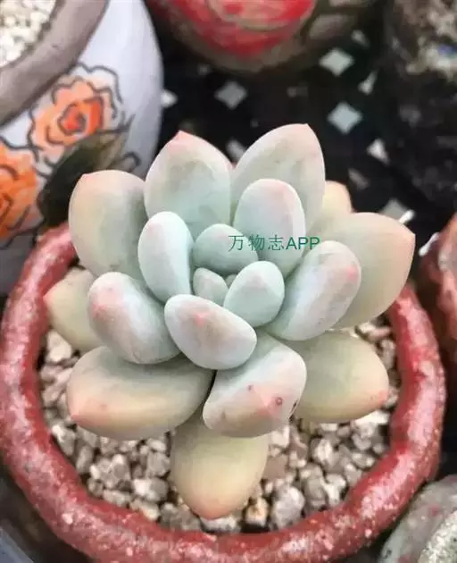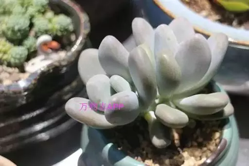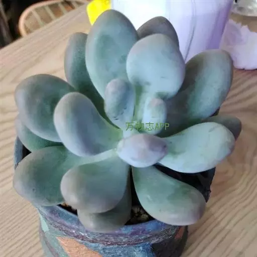 肉质叶互生,呈延长的莲座状排列,倒卵形至倒卵状椭圆形,长3~5厘米,宽1.8~3厘米,厚约0.8~1.7厘米,先端圆钝,表面平滑,叶色从泛蓝的灰绿色至淡紫色不等,被有浓厚的白粉。