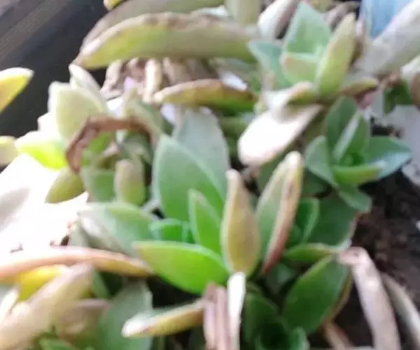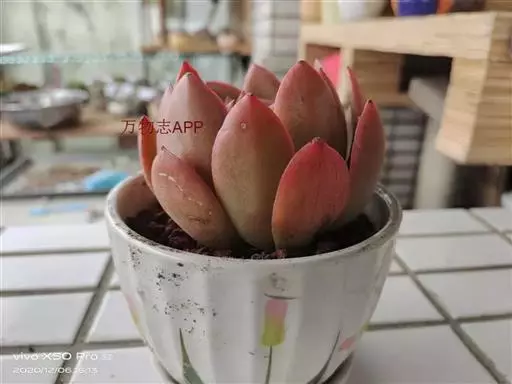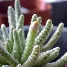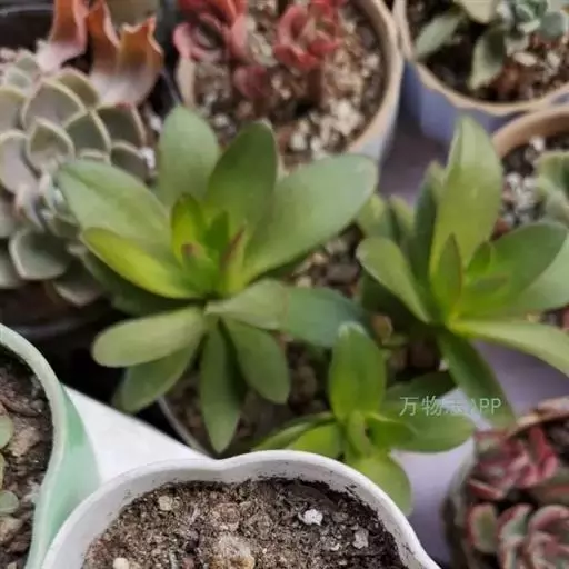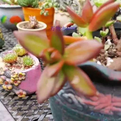 多肉植物,植株丛生,长圆形肉质叶交互对生,排列紧密,使植株呈四棱状,叶面有毛点,在光 照充足的条件下肉质叶呈浅绿色至深红色,特别是秋末至春季,由于此时昼夜温差较大且阳光充足,叶色更为鲜艳。聚伞花序,小花黄白色。