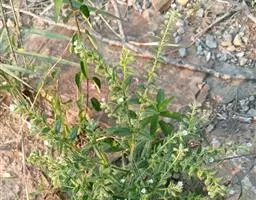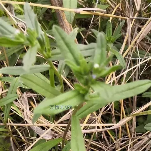 一年生草本。根稍含紫色物质。茎通常单一,高15-35厘米,自基部或仅上部分枝有短糙伏毛。叶无柄,倒披针形至线形,长2-4厘米,宽3-7毫米,先端急尖,两面均有短糙伏毛。聚伞花序生枝上部,长可达10厘米,苞片与叶同形而较小;花序排列稀疏,有短花梗;花萼裂片线形,长4-5.5毫米,通常直立,两面均有短伏毛,果期长可达11毫米且基部稍硬化;花冠高脚碟状,白色,有时蓝色或淡蓝色,筒部长约4毫米,外面稍有毛,檐部长约为筒部的一半,裂片卵形或长圆形,直立或稍开展,长约1.5毫米,稍不等大,喉部无附属物,但有5条延伸到筒部的毛带;雄蕊着生花冠筒下部,花药长约1毫米;花柱长1.5-2毫米,柱头头状。小坚果三角状卵球形,长约3毫米,灰褐色,有疣状突起。花果期4-8月。