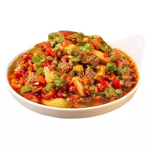 4,水开后放入糖,大火滚上一会后,放入切成滚块的尖椒和少量蒜片,等到汤快收完后倒入湿淀粉勾芡就做好了!